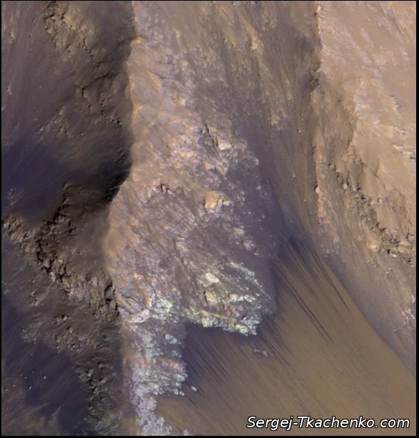 Вода на Марсе содержится в замороженном состоянии, главным образом, на его полюсах и в подповерхностных слоях грунта. NASA опубликовало фотографию сезонного водяного потока на крутом склоне каньона в долинах Маринера на Марсе. Снимок сделал орбитальный аппарат MRO еще 21 июля камерой HiRISE.